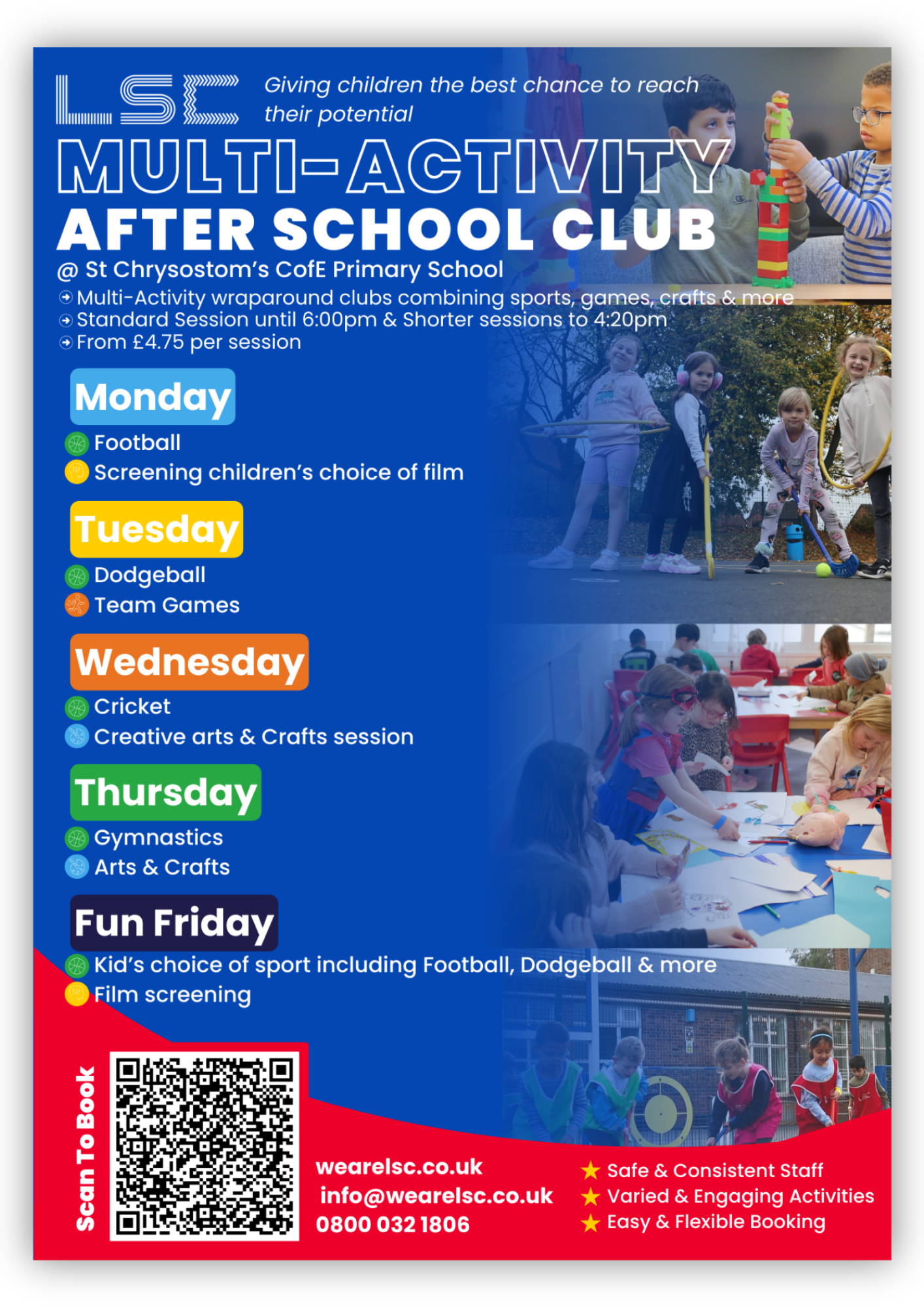 The LSC Multi-Activity Wraparound Club at St Chrysostom’s CofE Primary School offers affordable, high-quality after school childcare for families in Manchester. Running Monday to Friday during term time until 6:00pm, the programme combines sports, arts & crafts, STEM activities, IT, and games to give children a safe, structured, and fun experience after school. Parents can choose from flexible booking options including full-term, half-term, or individual sessions, with both standard and short sessions available. Led by trained, friendly staff, the clubs provide a balance of active play, creativity, and learning in line with government wraparound care guidelines. Bookings can be made easily online, with dedicated customer support available to help families secure their child’s place.